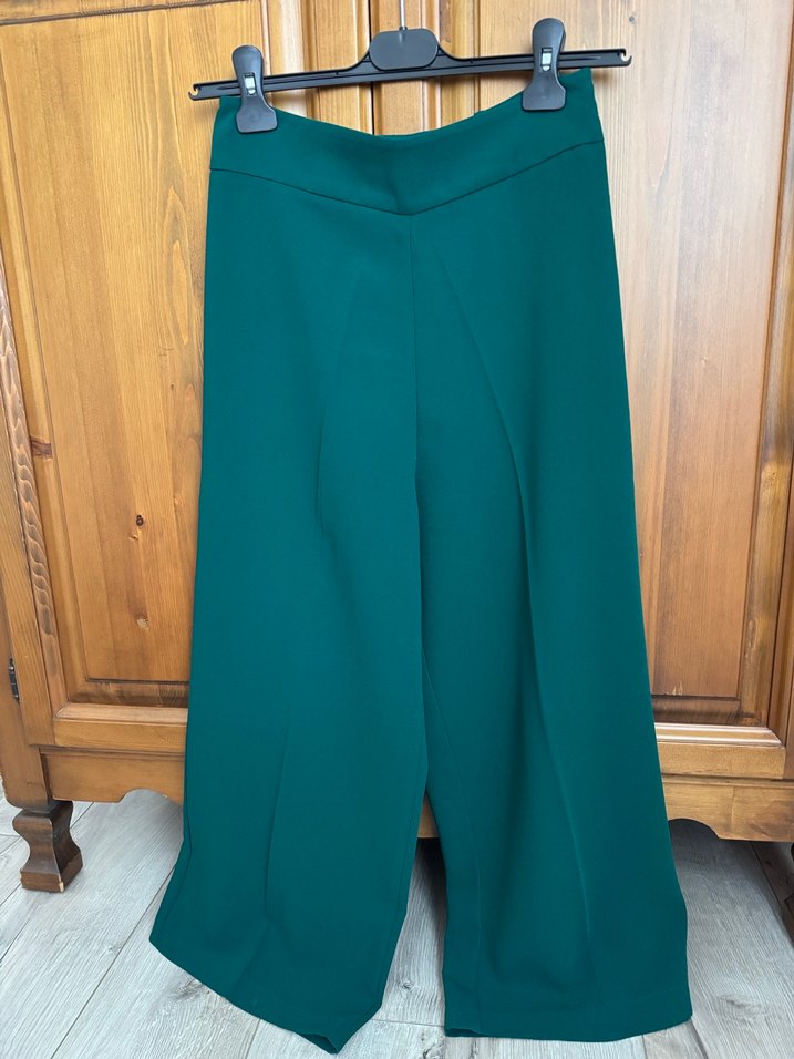 Yeşil renkte, midi boyda kadın pantolonu. Sentetik kumaştan yapılmış, parlak görünümlü ve ofis tarzına uygun, rahat kesim.