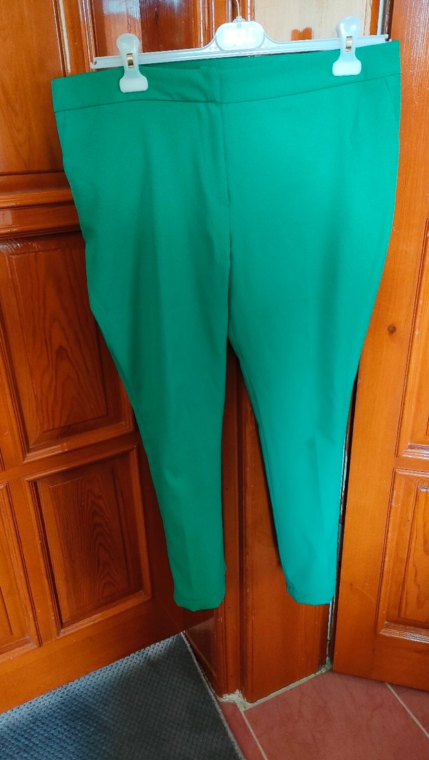 Yeşil midi boy kumaş pantolon, regular fit ve fermuarlı detaylı, parlak görünümlü, ofis kullanımı için uygun. ✨