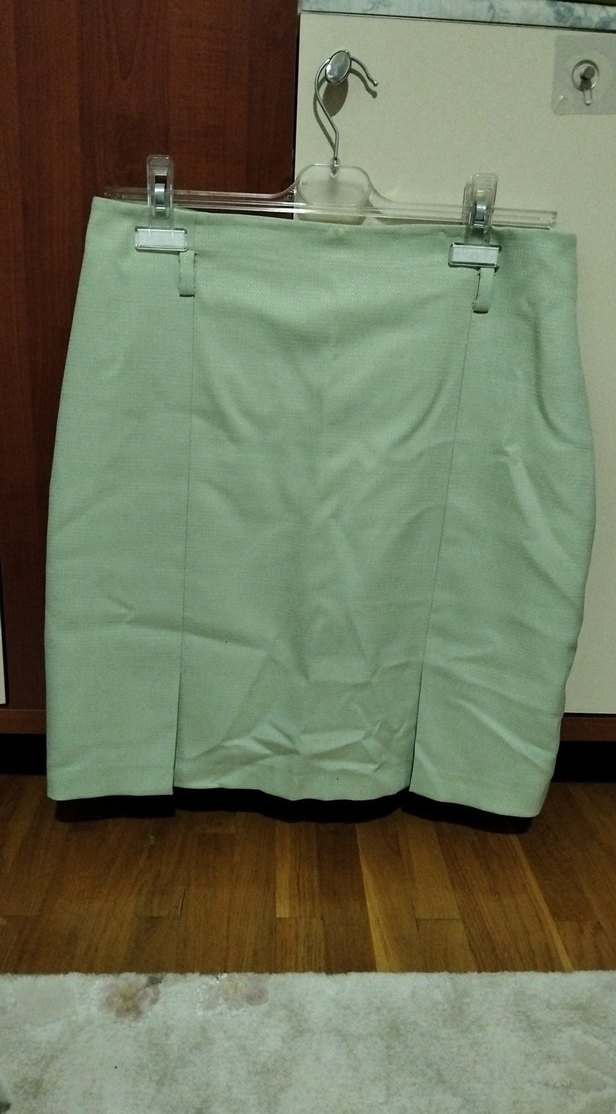 Pastel yeşil midi kalem etek, pilili tasarım ve regular fit ile sentetik kumaştan üretilmiştir. Ofis için uygun, minimalist normcore tarzda.