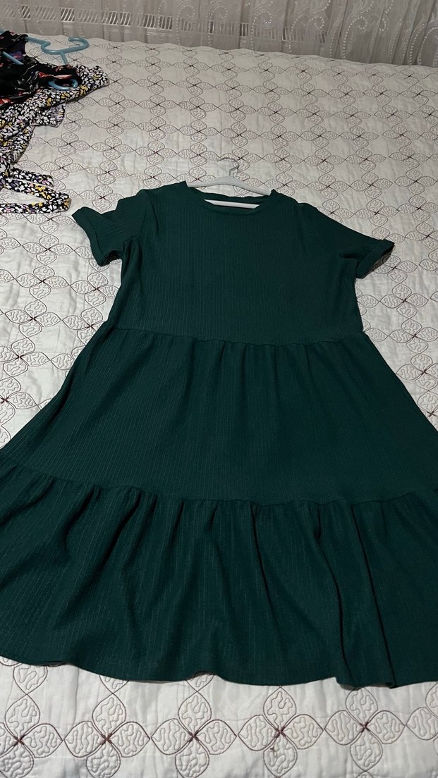 Kısa kollu, yuvarlak yakalı, salaş kesimli ve fırfırlı detaylı koyu yeşil midi elbise, yumuşak sentetik kumaştan günlük kullanım için uygundur.