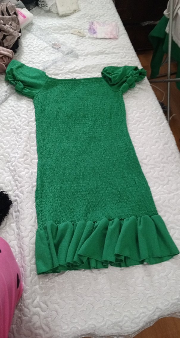 Yeşil midi elbise, kısa kabarık kollu ve etek kısmında fırfır detayına sahiptir. Yumuşak sentetik kumaştan, rahat bohem tarz için uygundur.