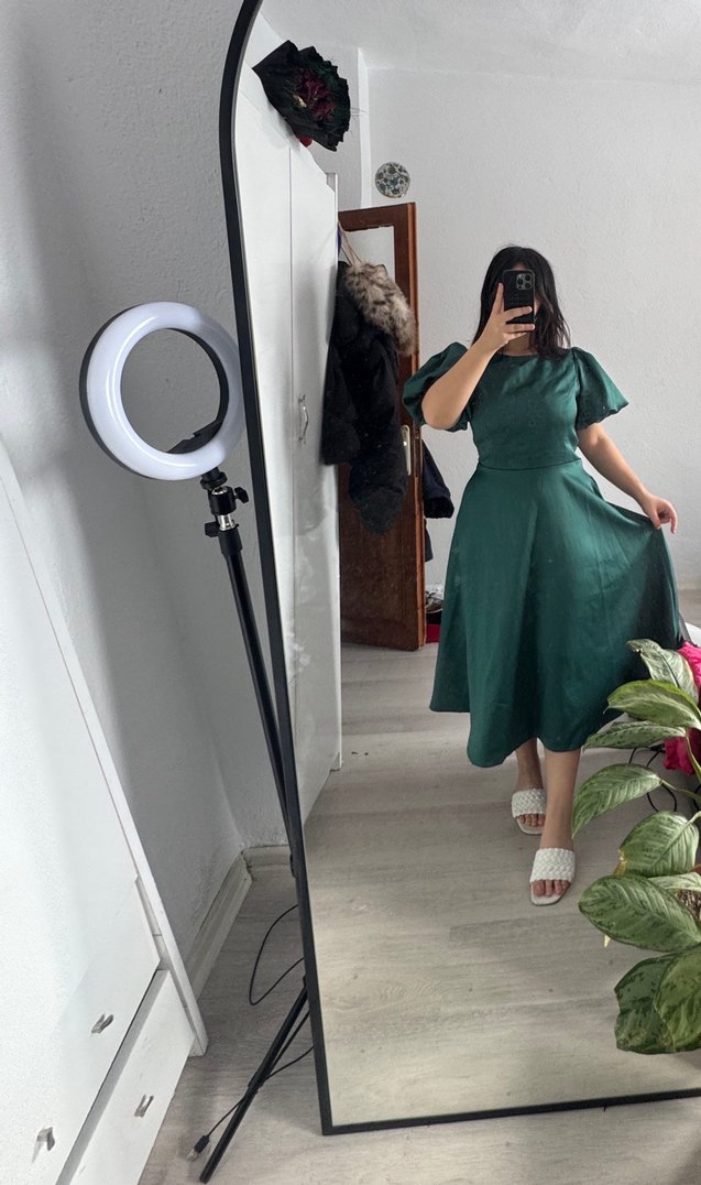 Yeşil midi elbise, straplez yakalı ve kısa kolludur. Yumuşak sentetik kumaştan, rahat ve şık günlük kullanım için bol kesimdir. ✨ üzerinde birkaç çizik mevcut sadece göze çarpmıyor