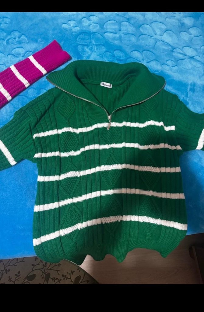 Yeşil triko midi kazak, boğazlı yaka ve uzun kolludur. Beyaz çizgiler ve fermuarlı yakasıyla rahat sokak stiline uygundur.