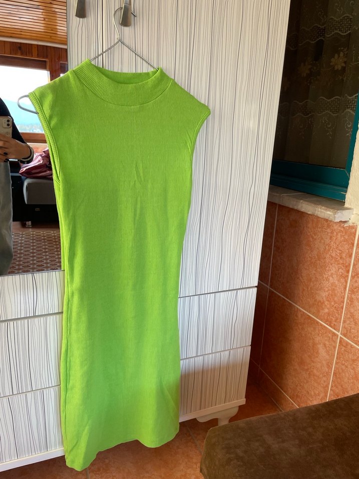 Kolsuz, yeşil midi elbise, yüksek yaka ve vücuda oturan kesime sahiptir. Yumuşak sentetik triko kumaştan yapılmıştır. Minimalist ve sokak modasına uygundur.