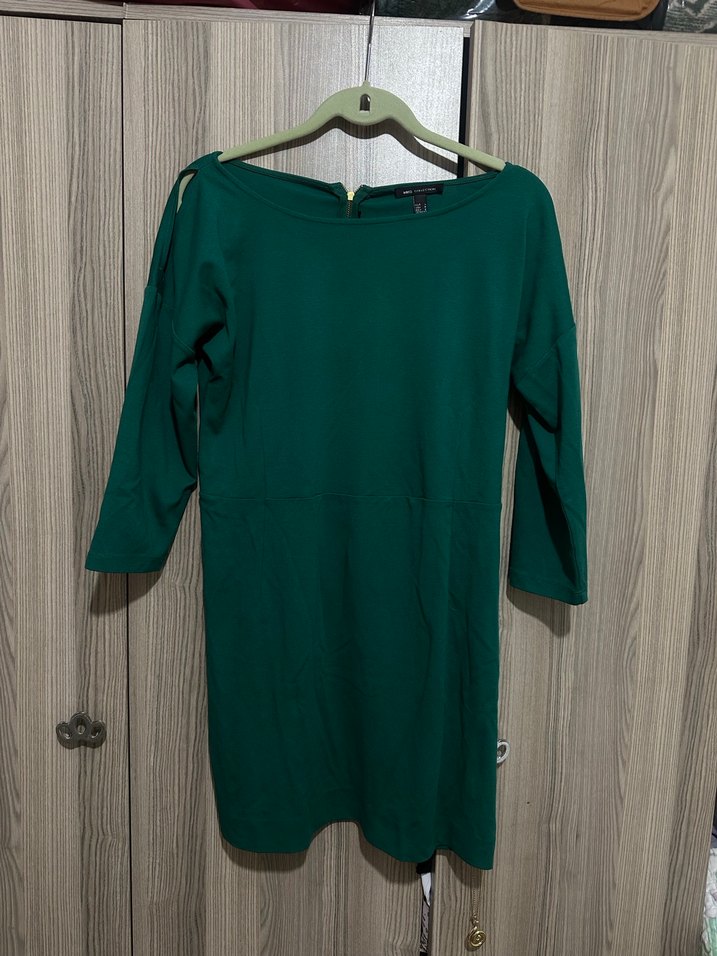 Dar kesim, uzun kollu yeşil midi elbise, bisiklet yaka ve sırtında fermuar detayı bulunur. Yumuşak sentetik kumaştan üretilmiştir, ofis kullanımı için uygundur.