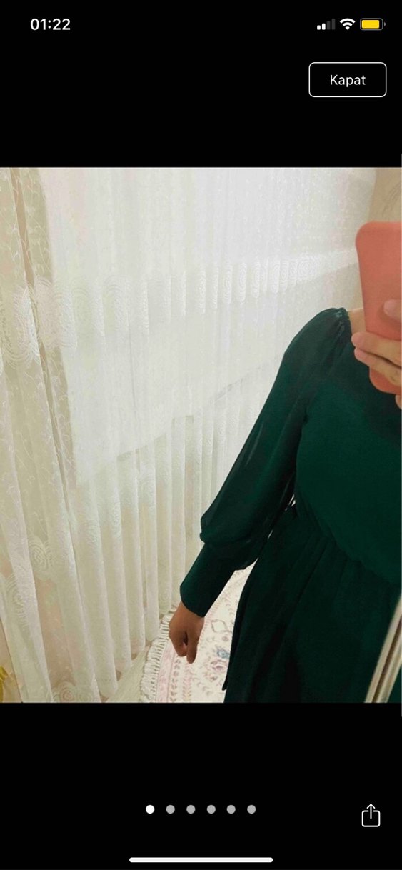 Yeşil midi boy, uzun kollu, yüksek yakalı, salaş ve drapeli elbise. Sentetik kumaştan, sade ve mütevazı stil için uygundur.