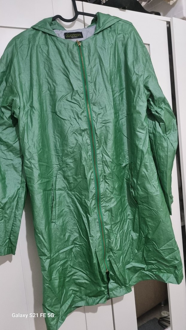 Bu yeşil uzunlukta keten yağmurluk, yakalı ve uzun kollu olup fermuarlı kapanışa sahiptir. Gevşek kesimi ve parlak dokusuyla minimalist dış mekan tarzına uygundur. ️