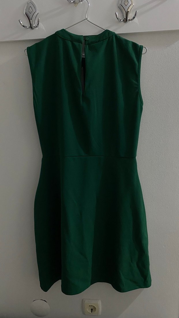 Yeşil midi boy, kolsuz, V yaka, drapeli ve vücuda oturan kesime sahip elbise. Ofis davet kullanıma için uygundur