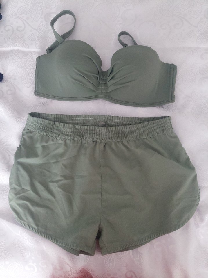 Kadınlar için yeşil renkli, rahat kesim, askılı üst ve mini şorttan oluşan bikini takımı, plaj için ufak tefek kusurları var resimleri inceleyin renk solma yok
