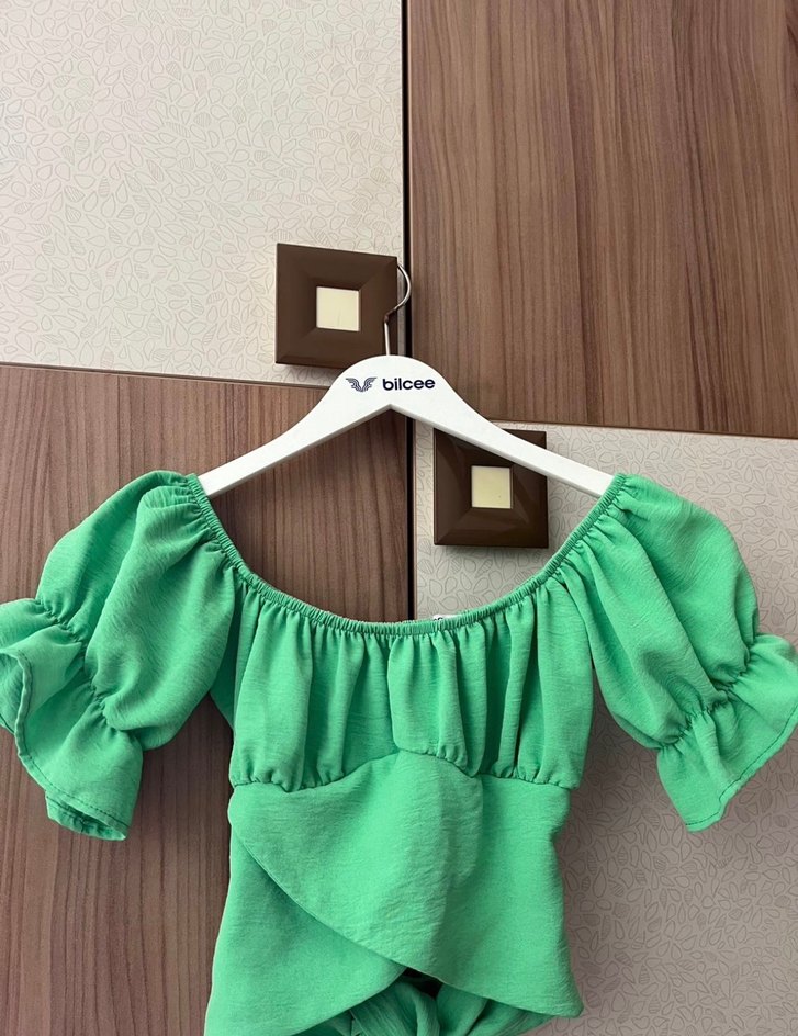 Yeşil Mini Bluz, Fırfırlı, Kayık Yaka