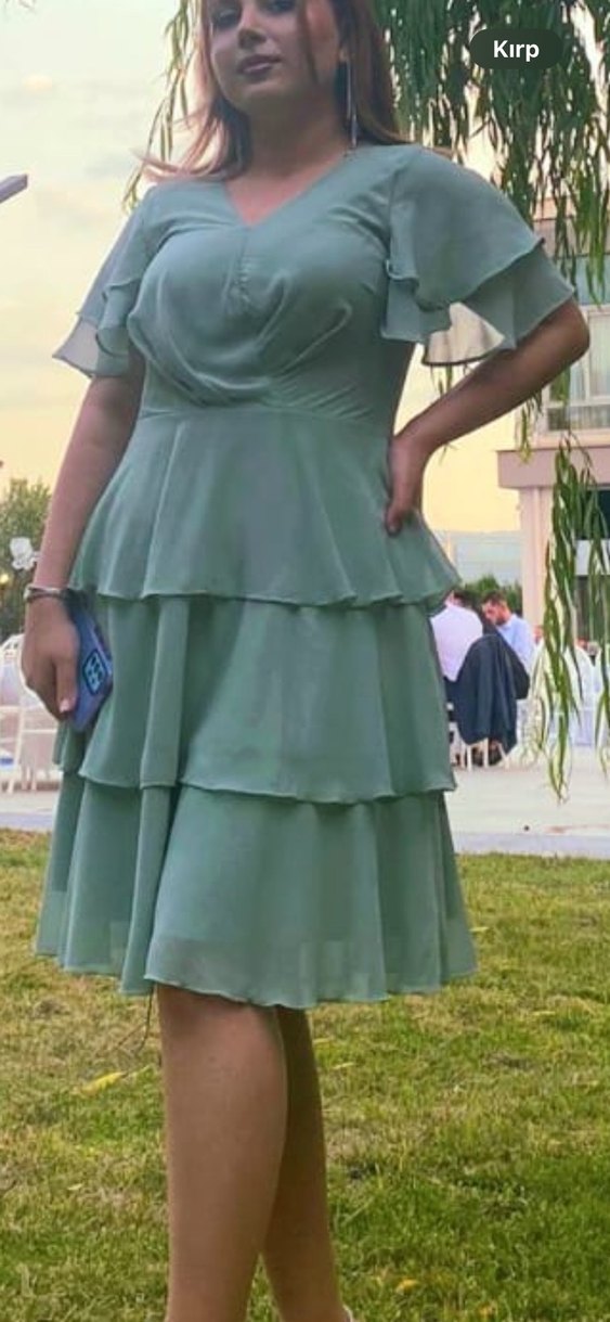 Açık yeşil mini elbise, salaş kesim, volanlı katmanlar ve V yakalı. Askılı kollu, vintage bohem tarzda, düğünler için uygun. Şifon kumaş çok tiril bi elbise düğünde bir kez giydim önü çok açıktı kapattırdım daha rahat ettim o gece kumaşı çok güzel kaliteli bu aylarda çok rahatlıkla tercih edilebilir
