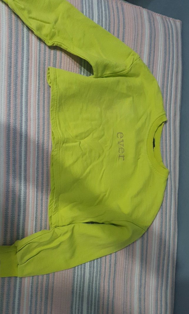 Pastel yeşil, uzun kollu, fitted crop sweatshirt. Önünde "ever" yazısı ve fermuarlı detaylar bulunur. Günlük athleisure tarzında. son ikiresimde gösterdiğim gibi minik lekeler var