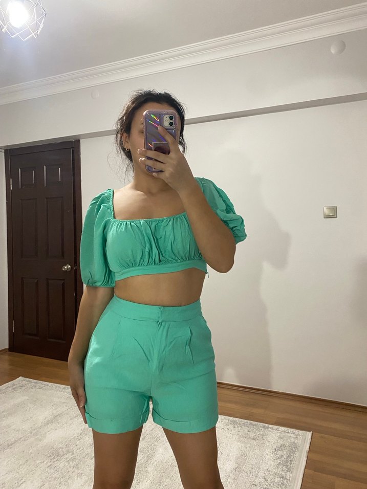 Yeşil mini crop top, straplez yakalı ve kısa kollu, yumuşak sentetik kumaştan takım halinde . Günlük kullanım için rahat ve şık bir görünüm sunar.