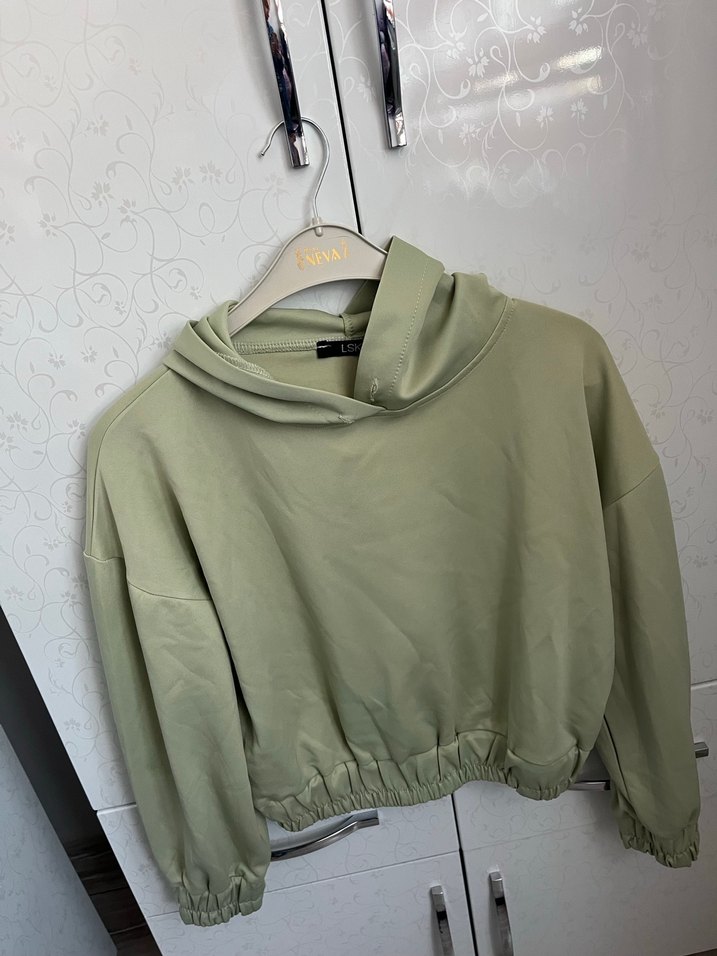 Pastel yeşil renkli, yüksek yakalı ve uzun kollu, dökümlü tasarımlı, kısa boylu keten sweatshirt. Rahat ve günlük sokak stiline uygun.