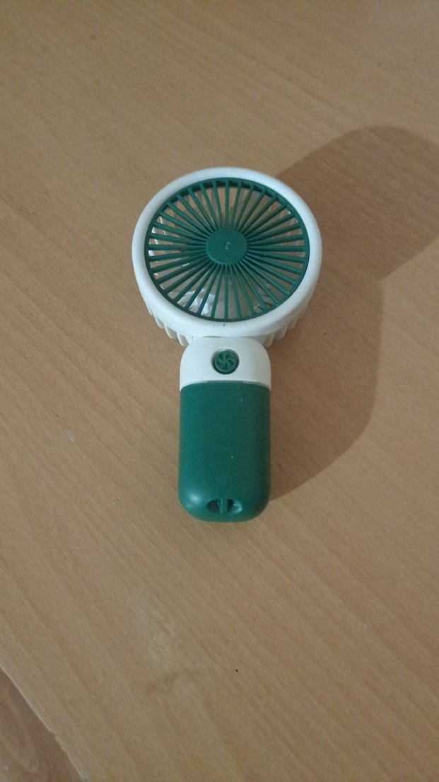 Yeşil ve beyaz renklerde, tek düğmeli küçük el vantilatörü. Kişisel serinleme için uygundur. ️