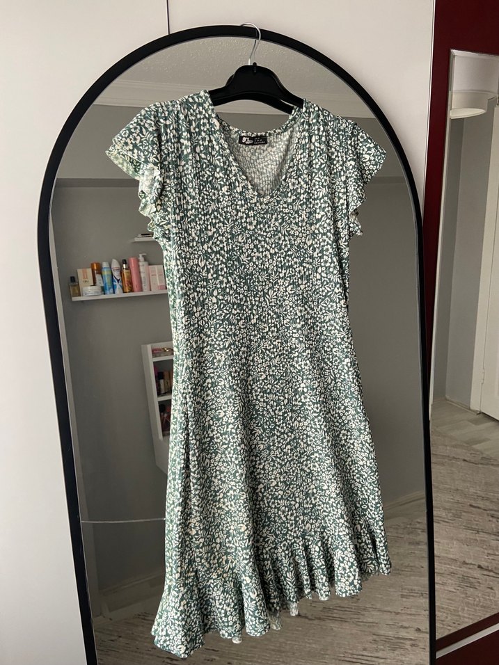 Yeşil renkte, V yaka ve kısa volanlı kollara sahip mini elbise