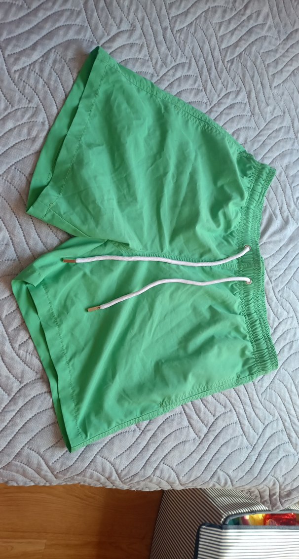 Pastel yeşil, düz tasarımlı ve beyaz bağcıklı, erkekler için mini mayo şortu. Plaj ve sokak stiline uygun rahat kesim.