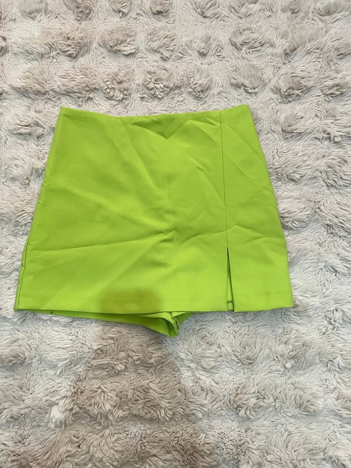 Yeşil renkli mini etek, kısa boy ve dar kesim ile küçük bir yırtmaç içerir. Sentetik kumaştan yapılmış, pastel tonu ile sokak ve athleisure stiline uygundur.