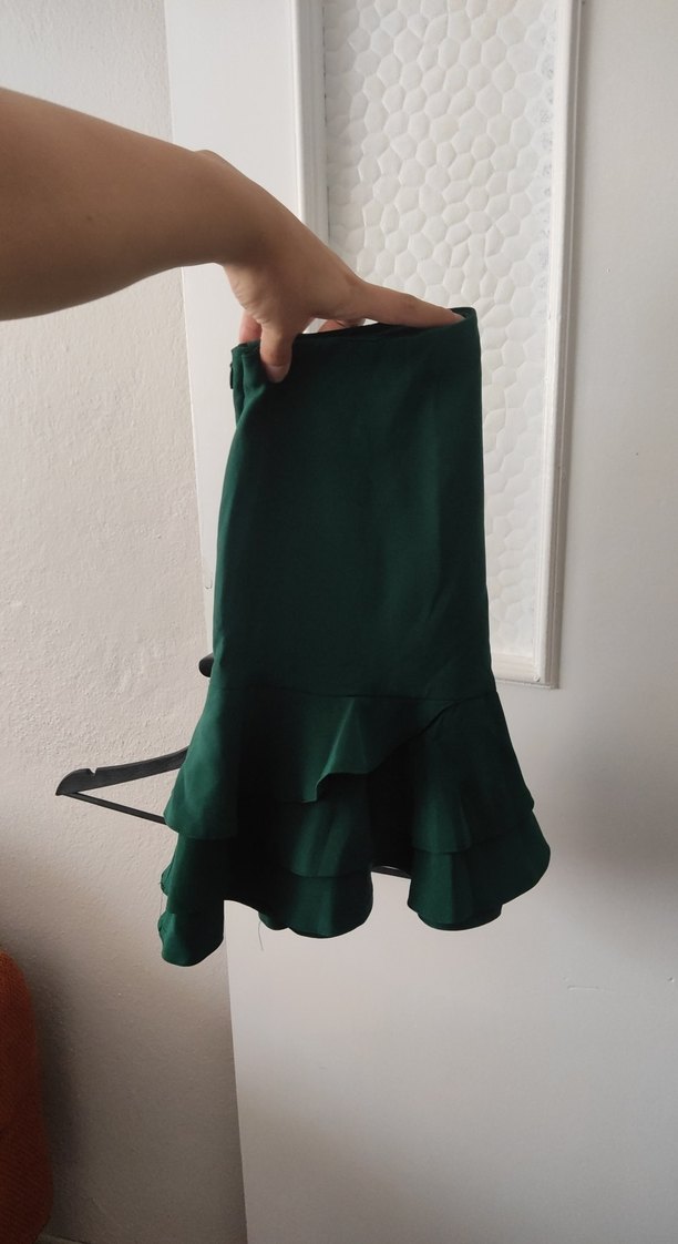 Koyu yeşil mini i,, vücuda oturan kesim ve etek ucu fırfır detaylarıyla minimalist sokak stili için uygun. #basic #yazlık #oversize #crop #ofis #parti #stil