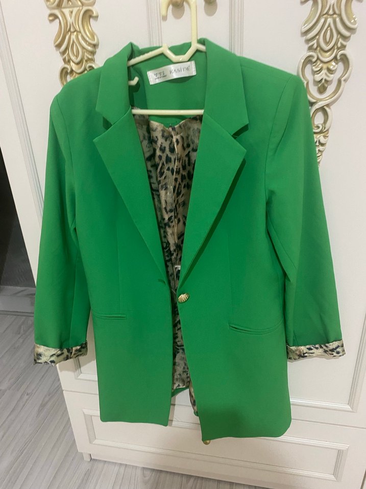 Yeşil mini blazer, kesik yaka ve uzun kolludur. Düğmeli, regular fit ve renkli yılan desenli astara sahiptir. Ofis için modern klasik tarzda.