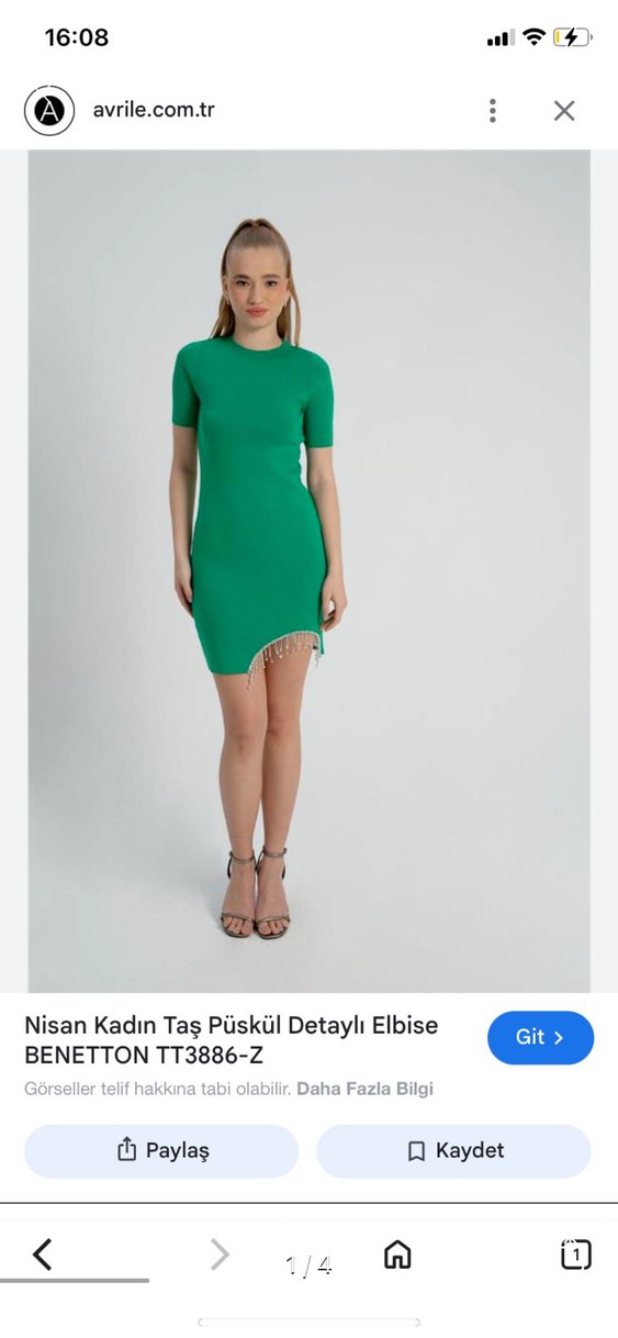 Parlak sentetik kumaştan yapılmış, kısa kollu ve yuvarlak yaka yeşil mini elbise. Taş püskül detaylarıyla sade ve şık, parti için uygun.