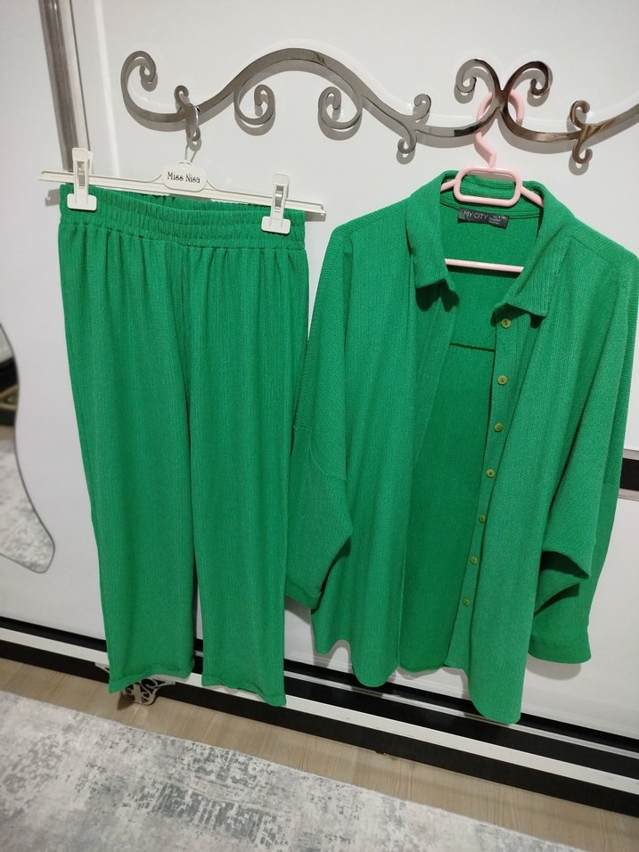 Yeşil keten kumaştan, bol kesim, mini boy ve uzun kollu kadın takımı. Yaka kısmı notched lapel, şık ve rahat bir görünüm sağlar.