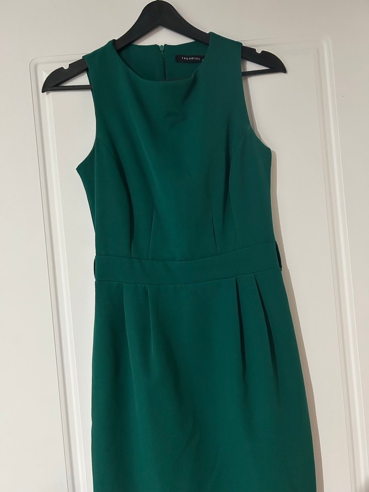 Yeşil mini kumaş elbise, yuvarlak yaka ve kolsuz tasarıma sahiptir. Sentetik kumaştan yapılmış, fermuarlıdır Ofis için uygundur. Marka Trendyol.