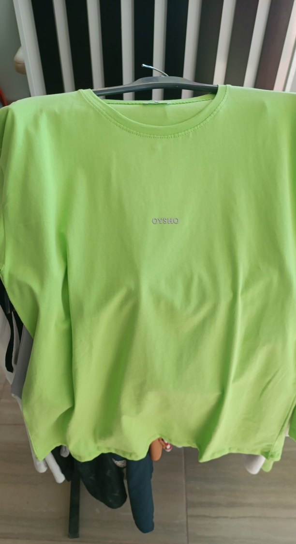 Yeşil renk, kısa kollu, yuvarlak yakalı kadın tişörtü. Sentetik kumaştan, rahat kesim ve pastel tonlarda. Önünde 'OYSHO' yazısı bulunur. Günlük kullanım için uygun.