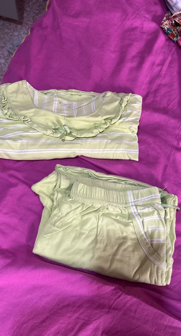 Yumuşak kumaştan, kısa kollu ve mini boy, rahat kesim yeşil kadın pijama takımı. Fırfırlı yakası ile konforlu. S-M beden uyumlu