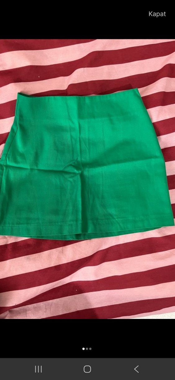 Yeşil renkte, pilili ve dar kesim kadın mini etek. Sentetik, pürüzsüz kumaştan, sokak stili ve partiler için uygundur.