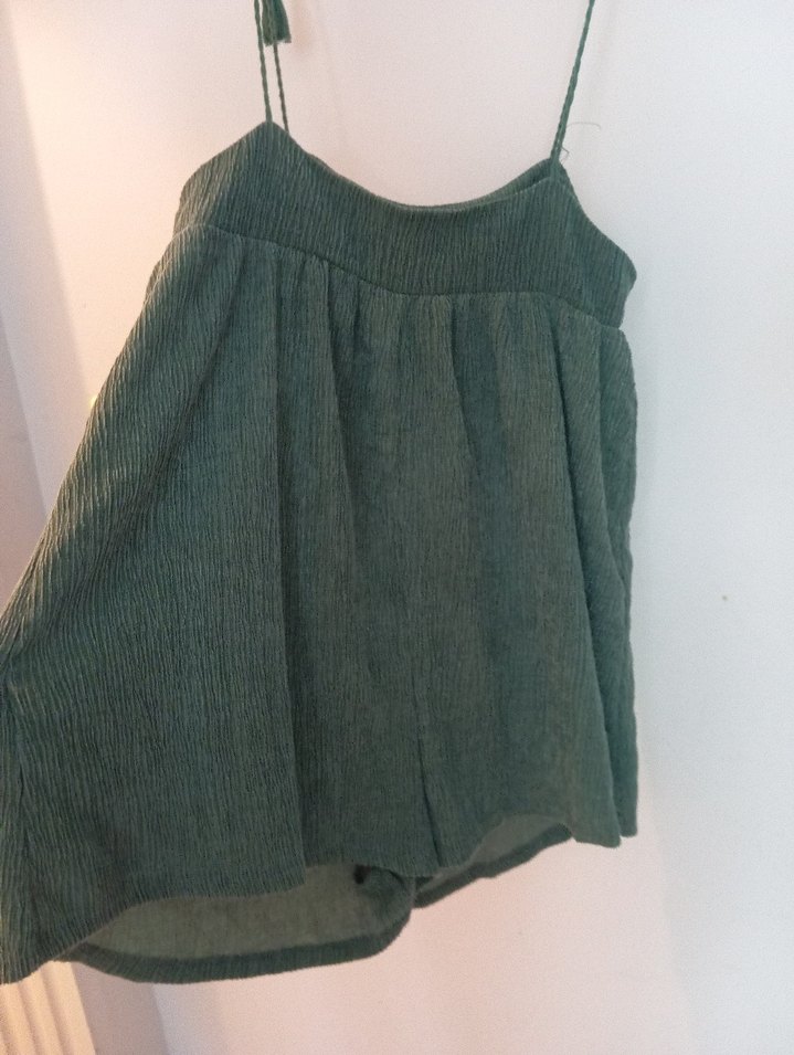 Yumuşak keten kumaştan yapılmış, bol kesim yeşil hamile eteği. Pliseli tasarımı ve mini boyu ile günlük kullanıma uygundur.