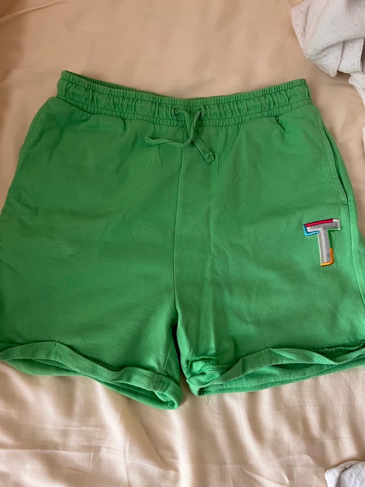 Yeşil mini şort, rahat kesim ve yumuşak tekstil kumaştan. Lastikli bel ve renkli 'T' detayı bulunur. Spor ve gündelik kullanıma uygundur.