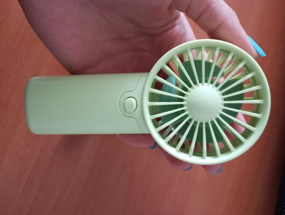 Basit açma/kapama düğmesine sahip yeşil mini taşınabilir el vantilatörü, kişisel serinlik sağlar. ️Rengi o kadar tatlı ki. Esiş gücü çok yüksek değil, az hava veriyor. Pilli.