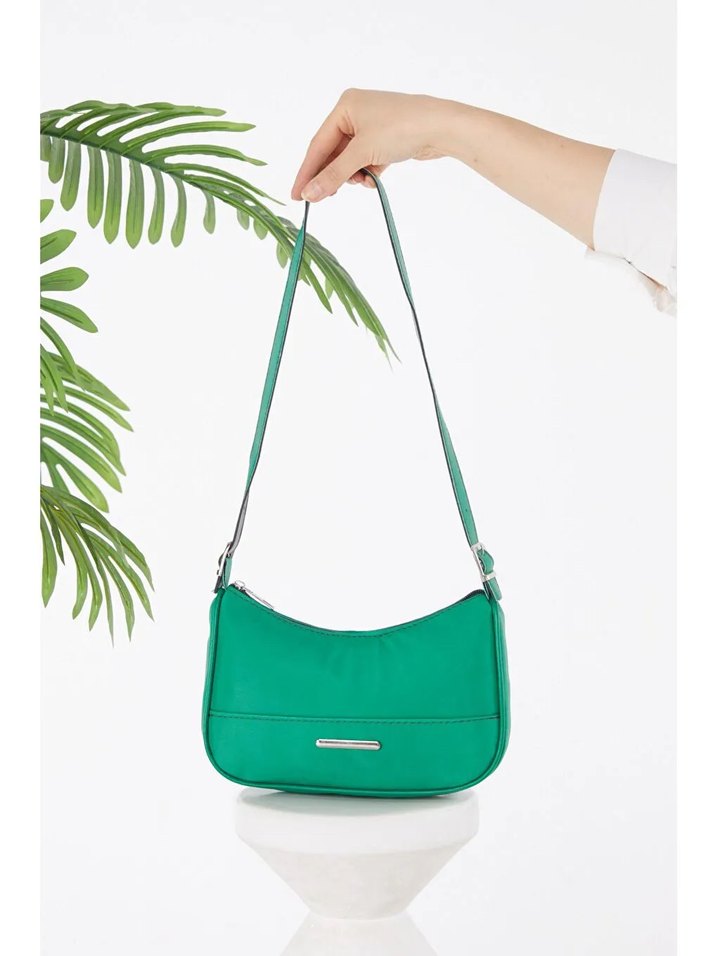 Pastel yeşil renkte, kemerli detaylı, sentetik kumaştan minimalist kadın omuz çantasıdır. Günlük kullanıma uygundur.