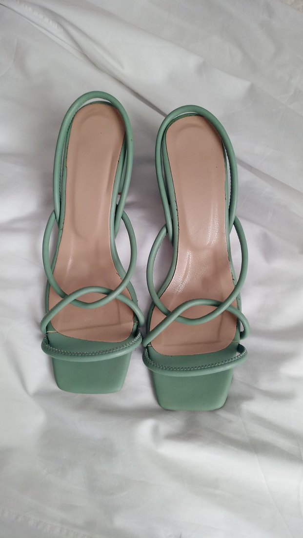 Pastel yeşil renkte, minimal tasarımlı, tokalı bantlı, stiletto topuklu kadın sandalet. Günlük kullanım için uygundur, dayanıklı kauçuk malzemeden yapılmıştır.