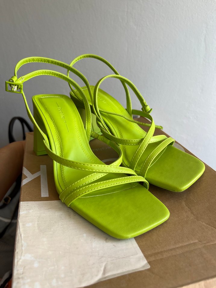 Yeşil kauçuk malzemeden, tokalı ince bantlı, minimal ve çağdaş stile sahip topuklu kadın sandalet. Hiç kullanılmadı iade süresi geçti
