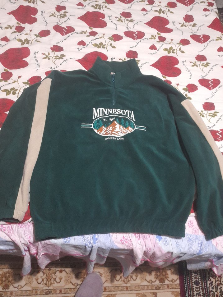Uzun kollu, yuvarlak yakalı, fermuarlı ve bol kesim koyu yeşil erkek polar. Üzerinde Minnesota ve dağ baskısı bulunur. Outdoor ve sokak stili için uygundur. ️