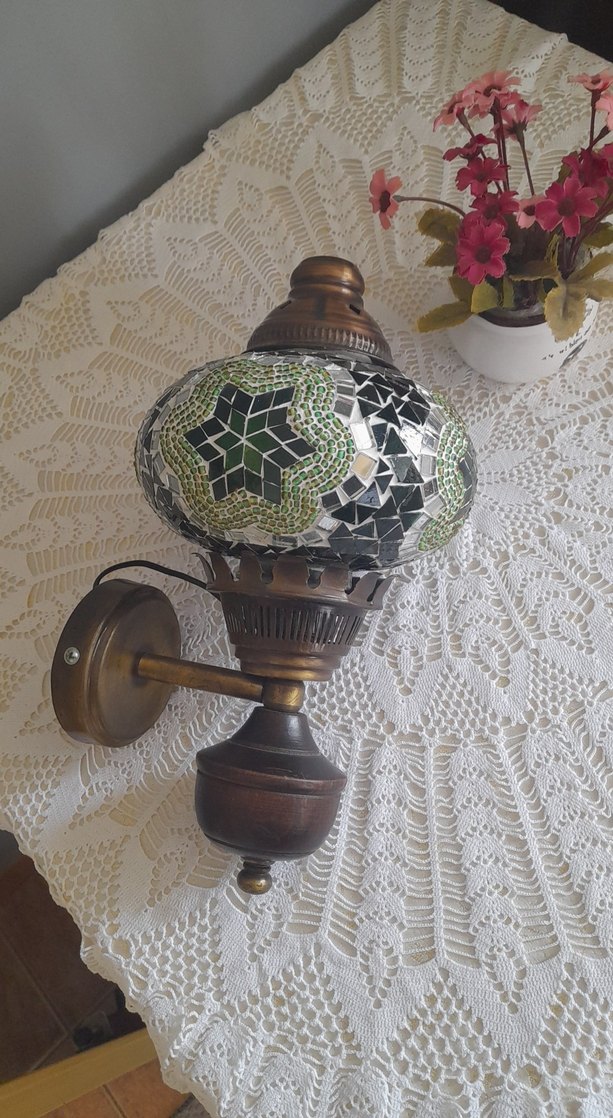 Yeşil ve siyah desenli mozaik camdan yapılmış, bronz kaplamalı metal tabana sahip duvar lambasıdır. Mekâna nostaljik bir hava katar. bende yeni almıştım.fakat duvarda yatağı olmadığı için,taktiramadim. yenidir.