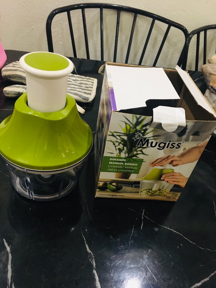 Mugiss marka yeşil manuel doğrayıcı, sebze ve baharatları kolayca doğramak için şeffaf bir kap ile birlikte elektrik gerektirmeden çalışır.