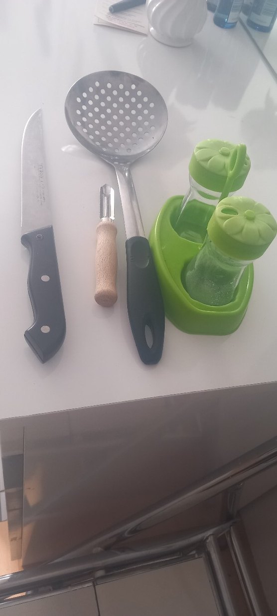 Bu mutfak setinde bıçak, sebze oyucu, delikli kepçe ve tutuculu iki yeşil baharatlık bulunur.