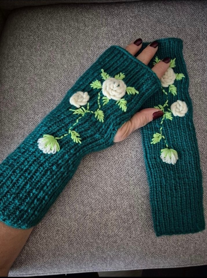Renkli çiçek nakışlı yeşil örgü eldivenler, rahat ve bohem bir tarz sunar. Parmaksız tasarımıyla retro hippie görünümüne uygundur.