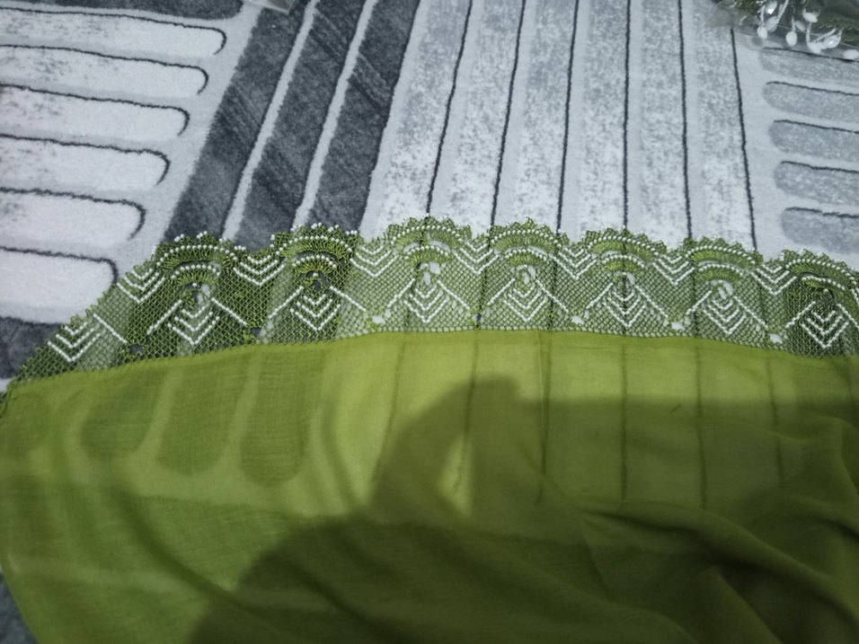 Yeşil renkte, nakış detaylı ve bohem tarzda bir perde. Kenarında gri tonlarında işlemeler bulunur, dekoratif bir görünüm sunar.