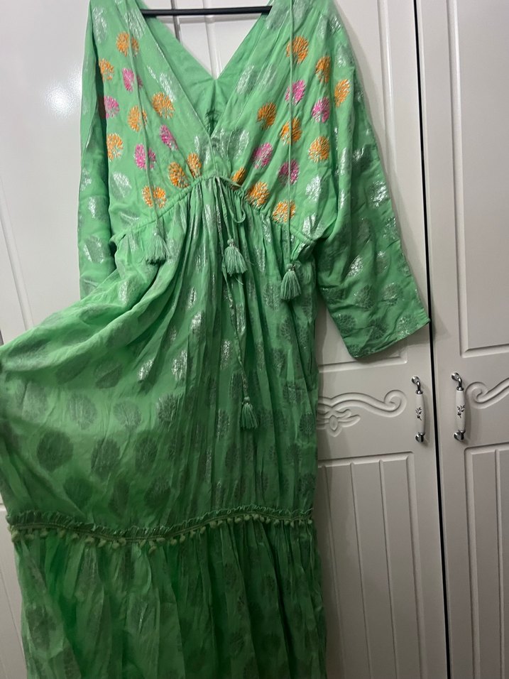 Parlak yeşil renkli, bol kesim, drapeli uzun kollu ve V yakalı elbise. Renkli nakış detaylarıyla bohem tarzda parti elbisesi.