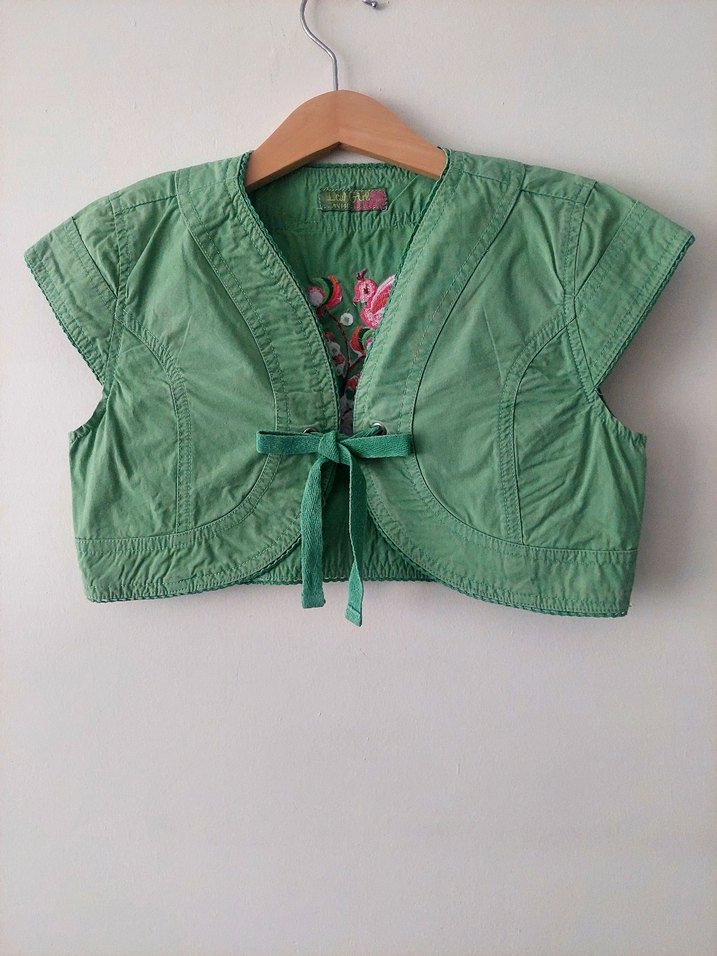 Nakışlı detaylara sahip, 10 yaş, bağcıklı ön kısmı olan yeşil kolsuz kız çocuk, bohem tarzda, bolero, yelek.