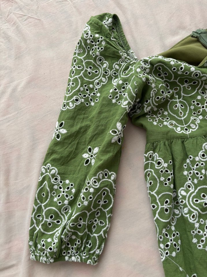 Yeşil renkli, uzun kollu bohem elbise, nakışlı dantel detaylara ve tekne yaka tasarıma sahiptir. Bol kesimdir ve günlük kullanıma uygundur.