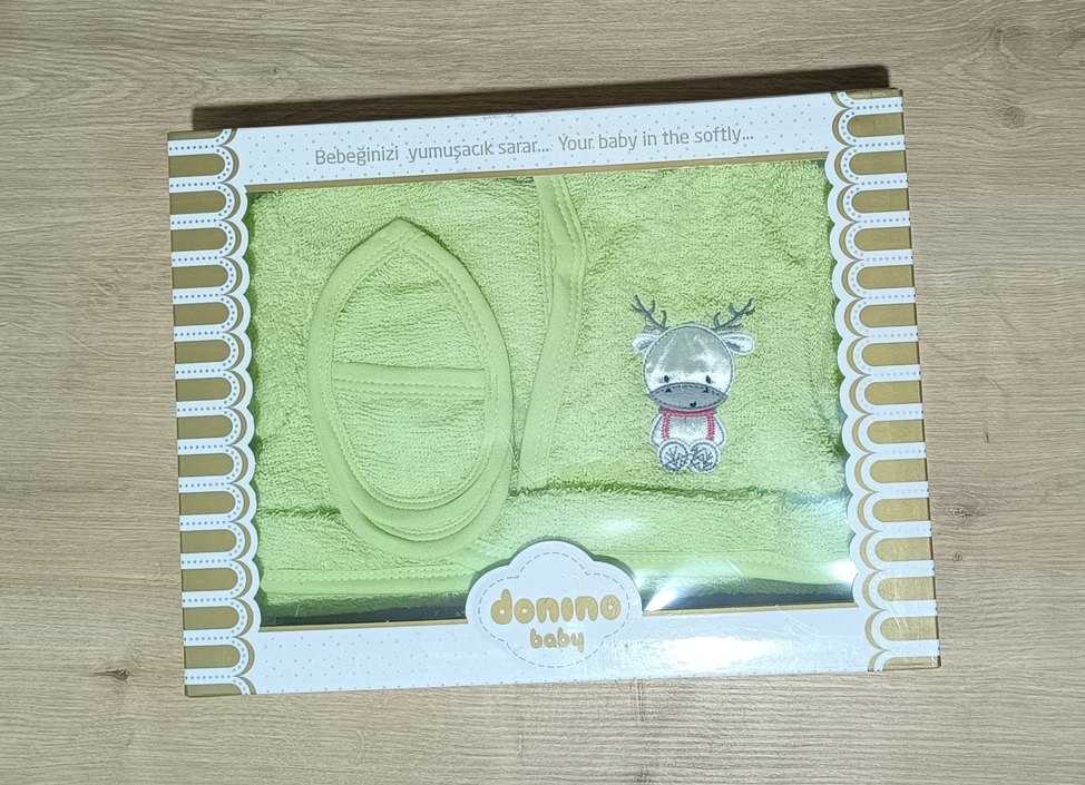 Yeşil renkli, nakışlı ve yumuşak kumaşlı erkek bebek bornoz seti. Marka: donono baby.