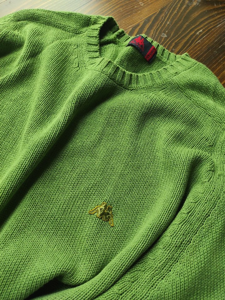 Yeşil renkli, nakış detaylı, bisiklet yaka ve uzun kollu erkek triko kazak, rahat kesimiyle günlük kullanıma uygundur.