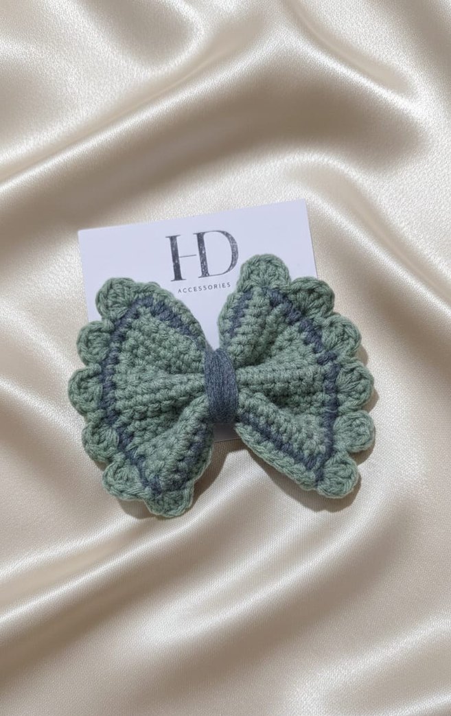 Yeşil nakışlı fiyonk tasarımlı, yumuşak pastel tonlarda, hafif bohem tarzında örgü saç tokası. Lastik yada 5cm toka uzerine hazirlanmaktadir. ADET FİYATIDIR, toplu sipariş verebilirsiniz.