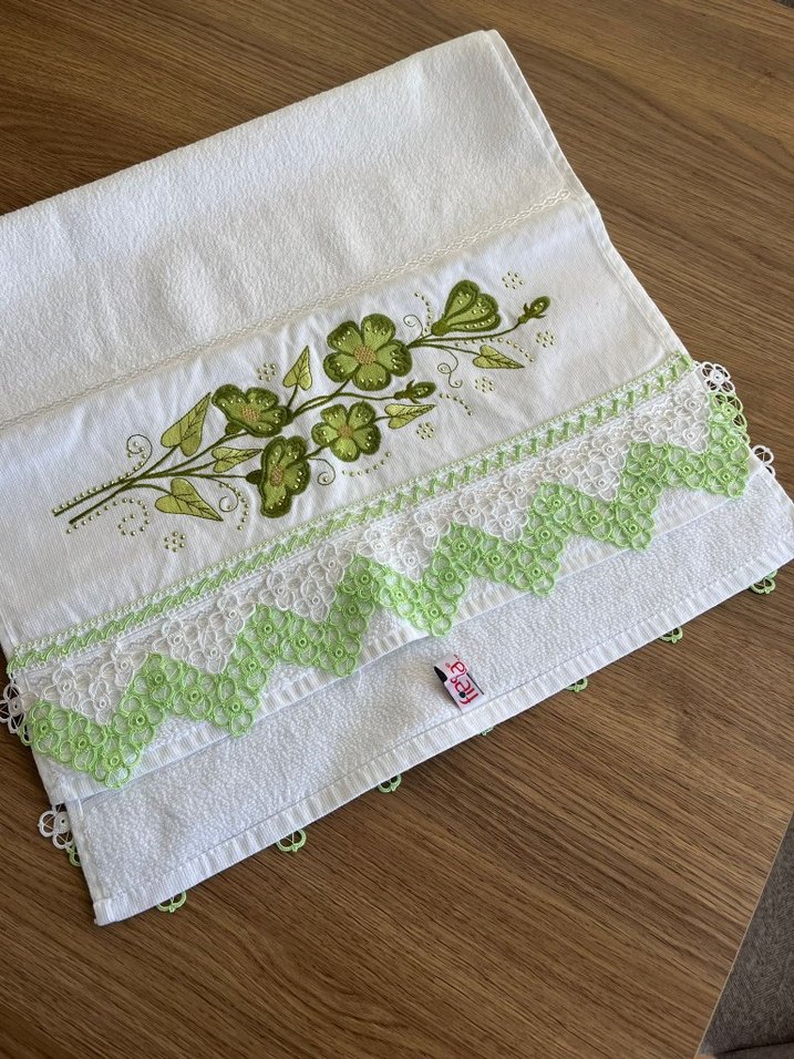 Bu açık yeşil geleneksel havlu, çiçek nakışı ve dekoratif dantel detaylarıyla klasik bir görünüme sahiptir.