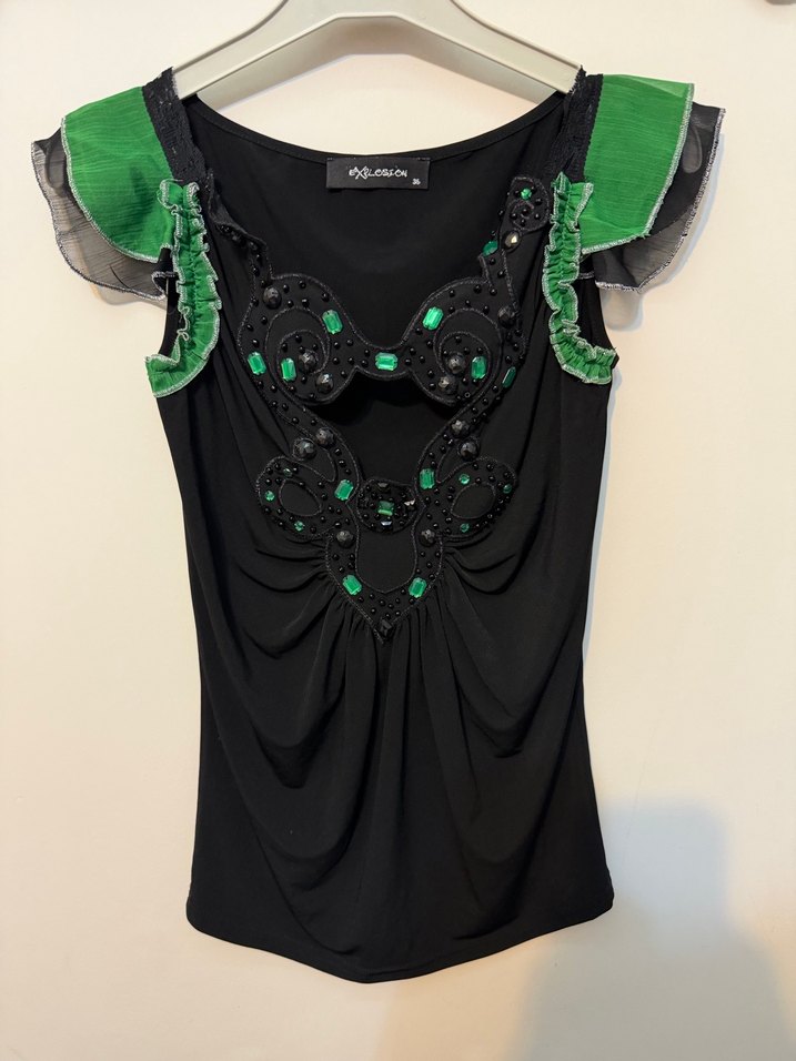 Boncuk taş işlemeli nakışlı. Omuzlarında yeşil fırfırları olan esnek kumaşta Şık bir bluz. Butik ürünü kusuru yok Siyah, yeşil nakışlı ve payetli, straplez yakalı, midi uzunlukta, vücuda oturan bluz. Parti için uygundur